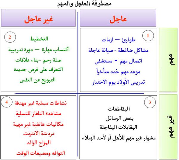 • الربع الرابع: الأمور غير العاجلة وغير مهمة وهي الأمور التي يمكن لنا أن ننساها.
